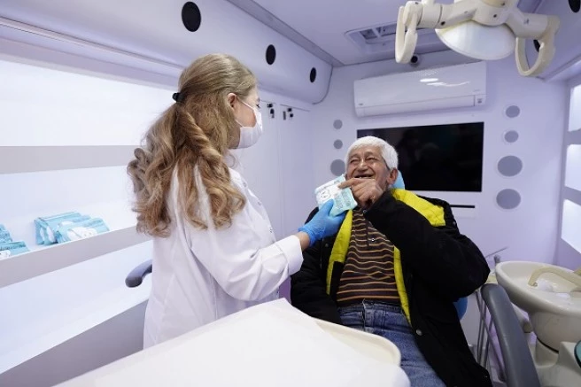 Diş hekimleri tarafından Mobil Sağlık Aracı'nda yapılan muayenelerin ardından sağlık kuruluşlarına gerekli yönlendirmeler de sağlanırken diş fırçası ve macundan oluşan setler hediye edildi.