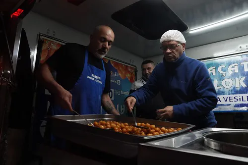 Mübarek üç ayların son kandili olan Berat Kandili’nde, Kartal Belediyesi, ilçedeki camilerin önüne konumlandırdığı ikram araçlarından taze lokma dağıttı.