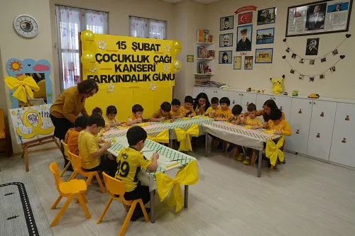 Uluslararası Çocukluk Çağı Kanserleri Günü olan 15 Şubat dolayısıyla düzenlenen programda, çocuklara yönelik farkındalık çalışmaları gerçekleştirildi. Erken evrede teşhis edilen çocukluk kanserlerinin önemine dikkat çekilen etkinlikte, sarı renk teması ön plana çıkarıldı. Çocukluk çağı kanseri farkındalığında sarı rengin umut, iyimserlik ve mutluluğu temsil etmesi nedeniyle etkinlik alanı sarı süslemelerle donatıldı. Minikler de sarı tonlarının ağırlıkta olduğu etkinlik materyalleriyle çalışmalarını gerçekleştirdi. Seramik papatya boyama etkinliğiyapan çocuklar hem farkındalık çalışmalarına katıldı, hem de el becerilerine katkı sağladı.