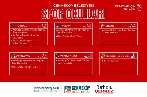 Çocuklara spor alışkanlığı kazandırmak ve gelişimlerini desteklemek amacıyla düzenlenen spor okullarında, 7 farklı branşta alanında uzman antrenörler eşliğinde eğitimler verilecek. Çocukların sporla tanışarak daha sağlıklı bir gelişim göstermeleri amacıyla düzenlenen Çekmeköy Belediyesi Spor Okulları’nda 2. dönem kayıtlarını başladı. Çocuklara spor alışkanlığı kazandıracak ve çeşitli alanda yeteneklerini geliştirmelerini sağlayacak spor okullarında; futbol, basketbol, voleybol, cimnastik, taekwondo, boks ve yüzme branşlarında alanında uzman antrenörler tarafından eğitimler verilecek. Spor okullarında kayıtlar Çekmeköy Belediyesi web sitesi üzerinden gerçekleştirilecek. Her branşta için farklı yaş aralıklarında eğitimlerin verileceği spor okullarında; futbol branşında eğitimler 6-13 yaş aralığında ki çocuklar için; Alemdağ Dr. Kadir Topbaş Spor Kompleksi, Av. Sıddık Eraslan Sosyal ve Spor Tesisleri ve Necati Alkan Spor ve Kültür Merkezi’nde verilecek. Yüzme branşında eğitimler 5-12 yaş aralığında ki çocuklara; Alemdağ Dr. Kadir Topbaş Spor Kompleksi ve Celal Erdoğan Spor Tesisleri’nde verilecek. Cimnastik branşında eğitimler 4-9 yaş aralığında ki çocuklara Celal Erdoğan Spor Tesisleri ve Alemdağ Dr. Kadir Topbaş Spor Kompleksi’nde verilecek. Taekwondo branşında eğitimler 7-12 yaş aralığında ki çocuklara Alemdağ Dr. Kadir Topbaş Spor Kompleksi’nde verilecek. Basketbol ve voleybol branşlarında ise eğitimlerden 9-15 yaş aralığında ki çocuklar faydalanabilecek.
