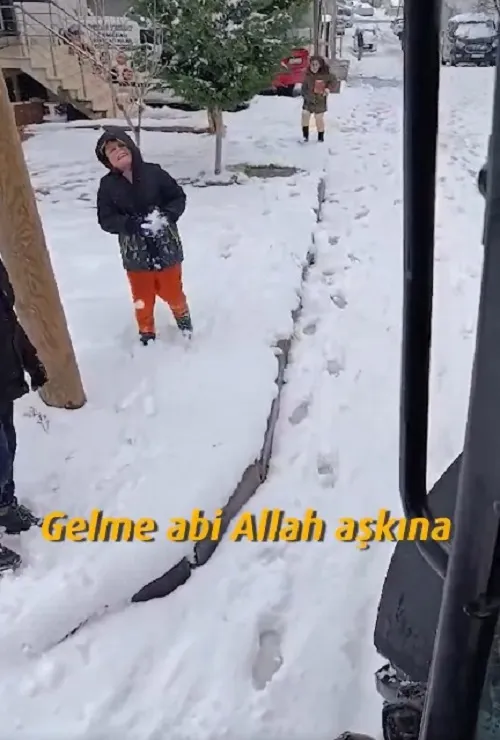 Sultanbeyli’de kar topu oynayan çocuklar kar küreme aracını görünce yolunu kesti. Sultanbeyli Belediyesi’ne bağlı kar küreme aracının şoföründen “Abi bu sokağa girme, sürekli karları temizliyorsunuz bırakın da oynayalım” şeklinde talepte bulundu.