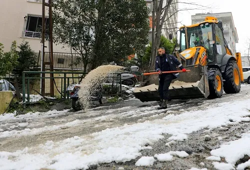 Dün beklenen yoğun kar yağışıyla birlikte yeniden sahaya çıkan ekipler, hiç vakit kaybetmeden çalışmalara başladı. Yeni hizmete alınan araçlarla güçlendirilen, 3 büyük tuzlama aracı, 8 küçük tuzlama aracı, 15 elle tuzlama aracı, 3 tuz nakil kamyonu, 47 JCB (Beko Loder), 1 grayder, 1 kato ve 2 loder aracı olmak üzere toplam 80 iş makinesinden oluşan filo ve 200 personel ile 5 bölgede çalışmalar devam ediyor.