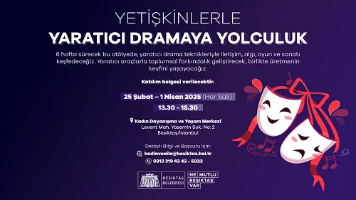Belediyemiz, Kadın Dayanışma ve Yaşam Merkezi bünyesinde yetişkinlere yönelik Yaratıcı Dramaya Yolculuk Atölyesi düzenliyor.